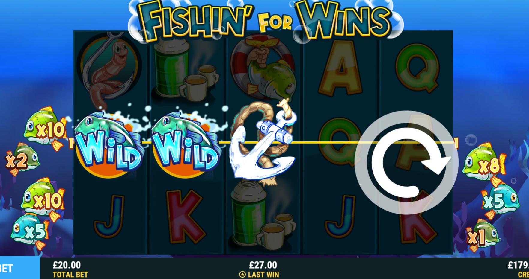 In the Fishin' For Wins real money online slot, players have the opportunity to reel in up to 15 Free Spins, each of which is accompanied by a unique bonus symbol that can multiply the player's winnings. What that means is your prizes can quickly ramp up and get big!
