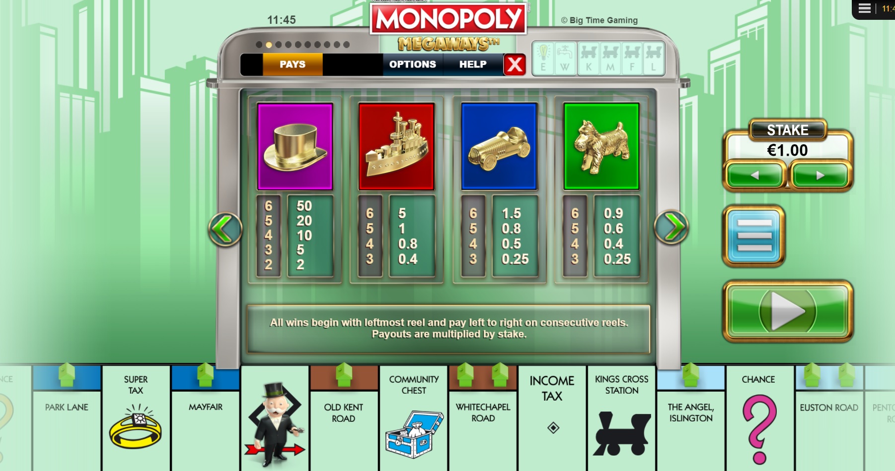 So many great Megaways slots features, we suggest you try out the gameplay using the Monopoly Megaways Casino slot free play mode by Big Time Gaming on their site.